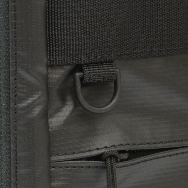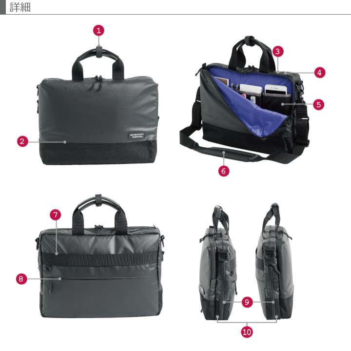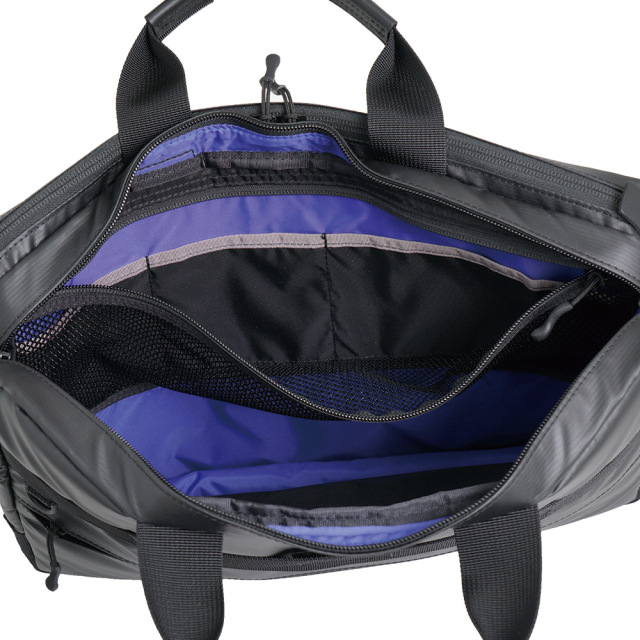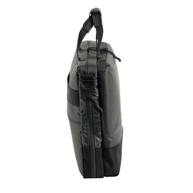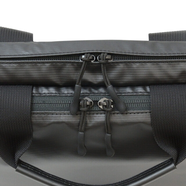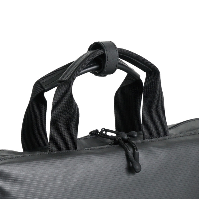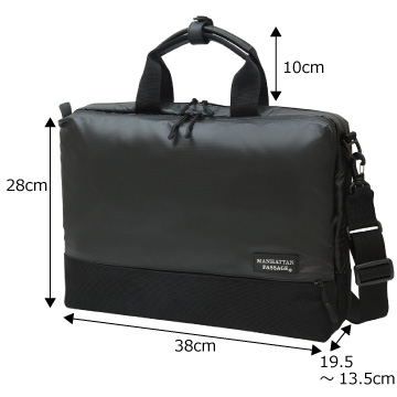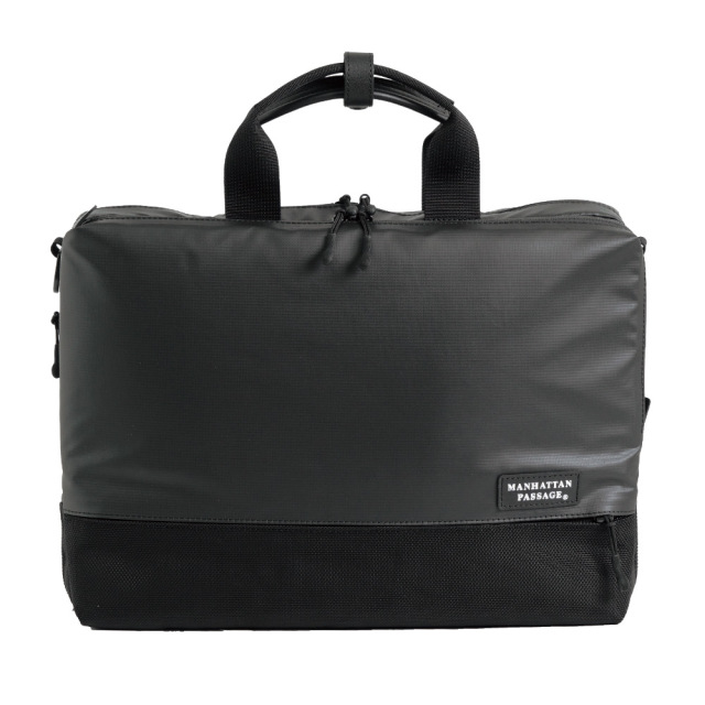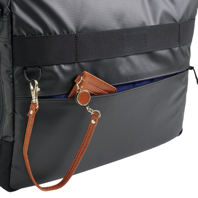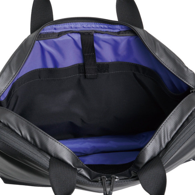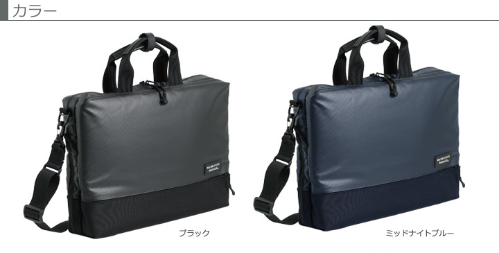 前面に2種類の生地を使用したコンビネーションデザイン。高撥水、薄マチで軽量、シンプルで多機能。収納物の量に応じてマチ幅を調節できるエキスパンダブル機能。A4サイズ対応。背面にはトローリーバッグに取り付けられるセットアップ用ベルト付き。就職活動や通勤、2本目にも。