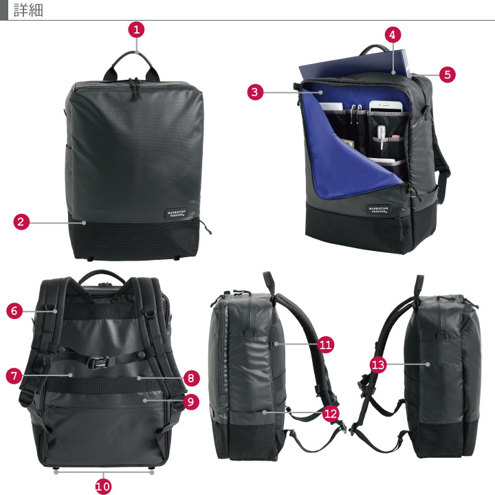 本体に軽量樹脂フレームを内蔵し、型崩れしにくく、自立しやすい仕様。本体前面に2種類の生地を使用したコンビネーションデザインデザイン。小物の収納に便利なポケットが充実。チェストベルトの取り外しができ、ショルダーベルトの取り付け位置を3段階で調整できます。背面にはトローリーバッグに取り付けられるセットアップ用ベルト付き。B4サイズ対応。