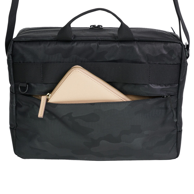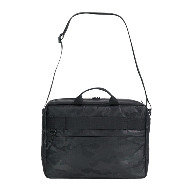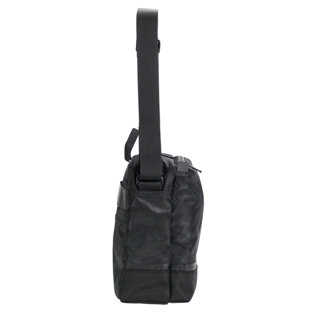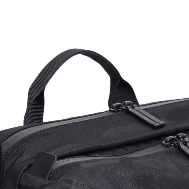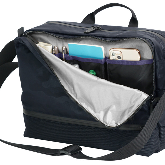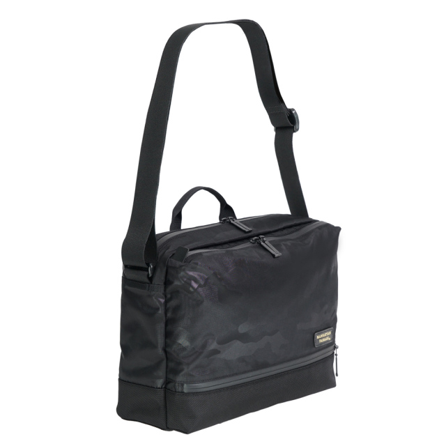 光の反射によって見え方が変化する、特殊加工を施したオリジナル素材とプレミアムゴールドのロゴ、止水ファスナーの使用が特徴。ぴったりA4サイズ対応の横型ショルダーバッグ。便利な手持ちハンドル付き。背面にはトローリーバッグに取り付けられるセットアップ用ベルト付き。 カジュアルだけでなくビジネスでも使える手頃なサイズ感です。
