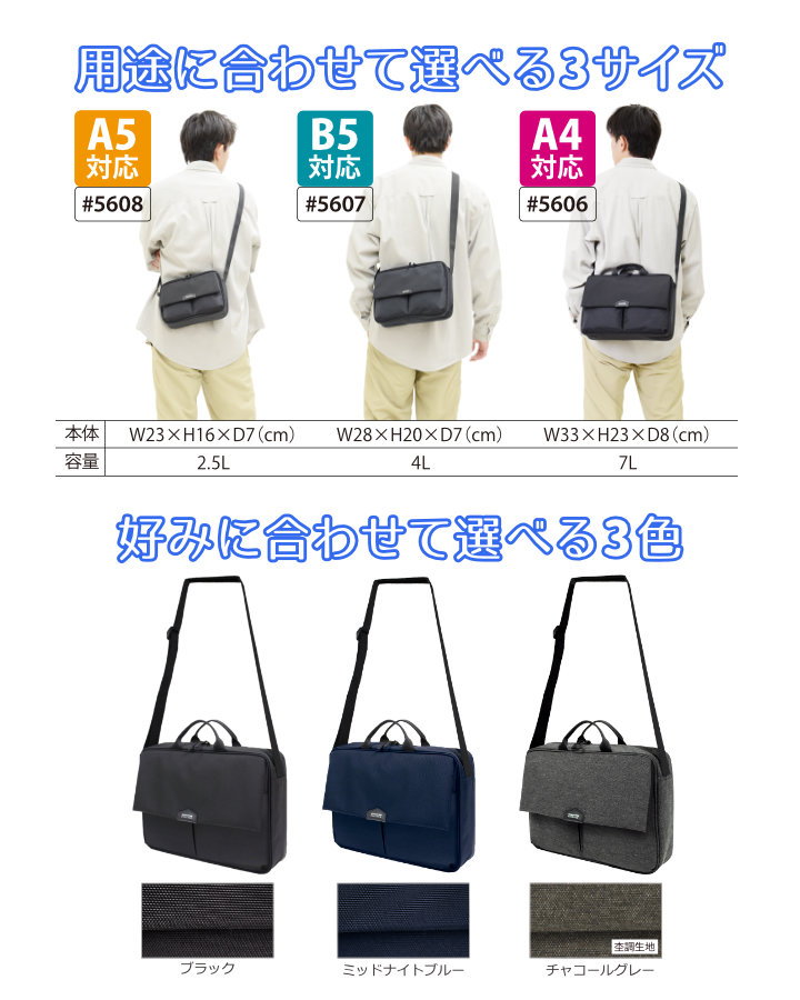 A4サイズに対応したスマートなデザインのショルダーバッグ。隠しマグネット式の前面フラップを採用し、フロントポケットへアクセスしやすくなっています。手持ちハンドルを備えて2WAYでの使用が可能で、通勤・通学はもちろん、お出かけや街歩きなどカジュアルなシーンにも対応します。