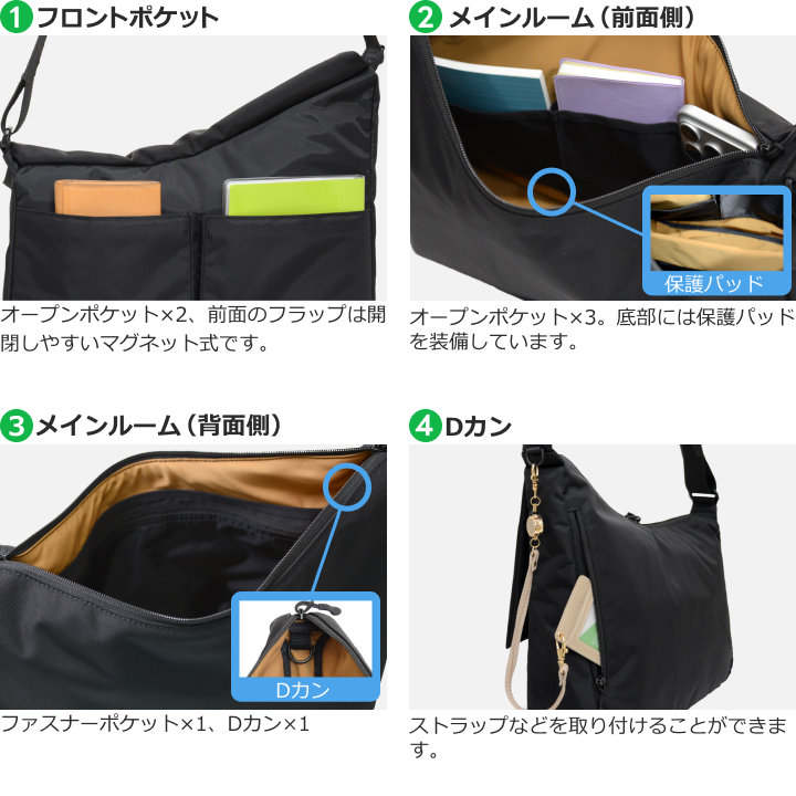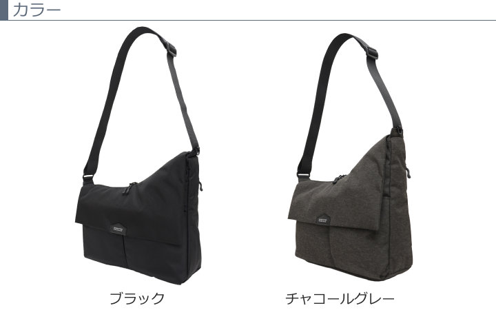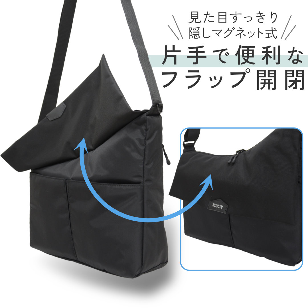 スマートなアシンメトリーデザインを採用したショルダーバッグ。隠しマグネット式の前面フラップを採用し、フロントポケットへのアクセスがしやすくなっています。ぴったりA4サイズ対応でビジネス/カジュアルどちらのシーンでも使い勝手の良い鞄です。