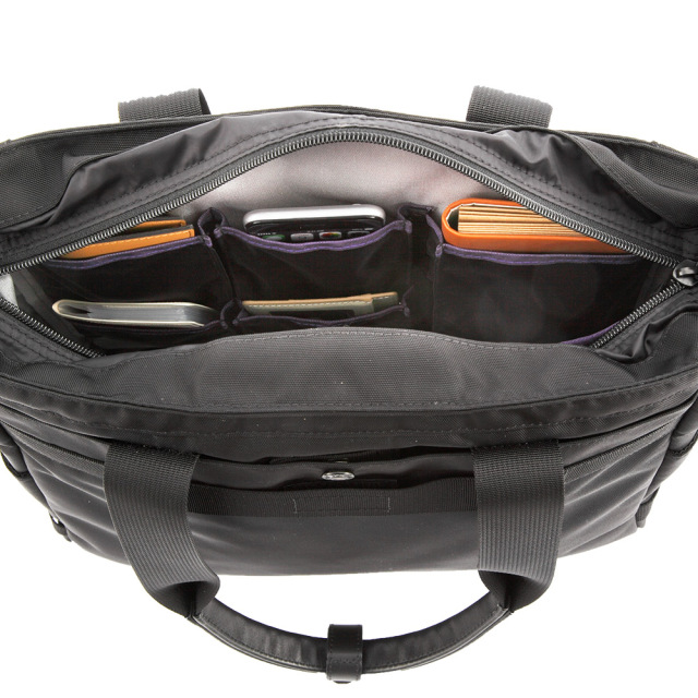 従来の「Lux」シリーズの実用的な機能がさらに進化したSTAGE2。肩のラインに合わせてハンドルがフィットしやすいよう2本のハンドルの長さに僅かな差をつけ、安定性を向上させました。2種類の生地を使用したコンビネーションモデル。A4サイズに対応したビジネストートバッグ。裏地に使用しているシルバーカラーの生地は一般的なナイロン生地と異なり繊維の断面が三つ葉型(Trilobal Fiber)で光を効率よく反射させ、鞄の中を明るく見せます。ポケット口にカラーテープを取り付け、視認性を高めています。洗練されたデザイン、かつ抜群の使いやすさです。