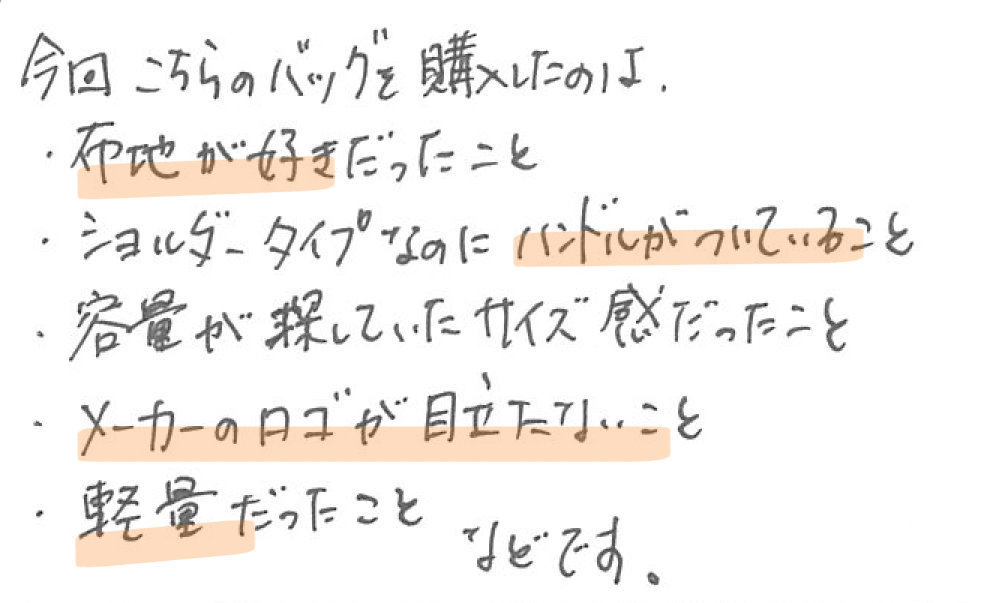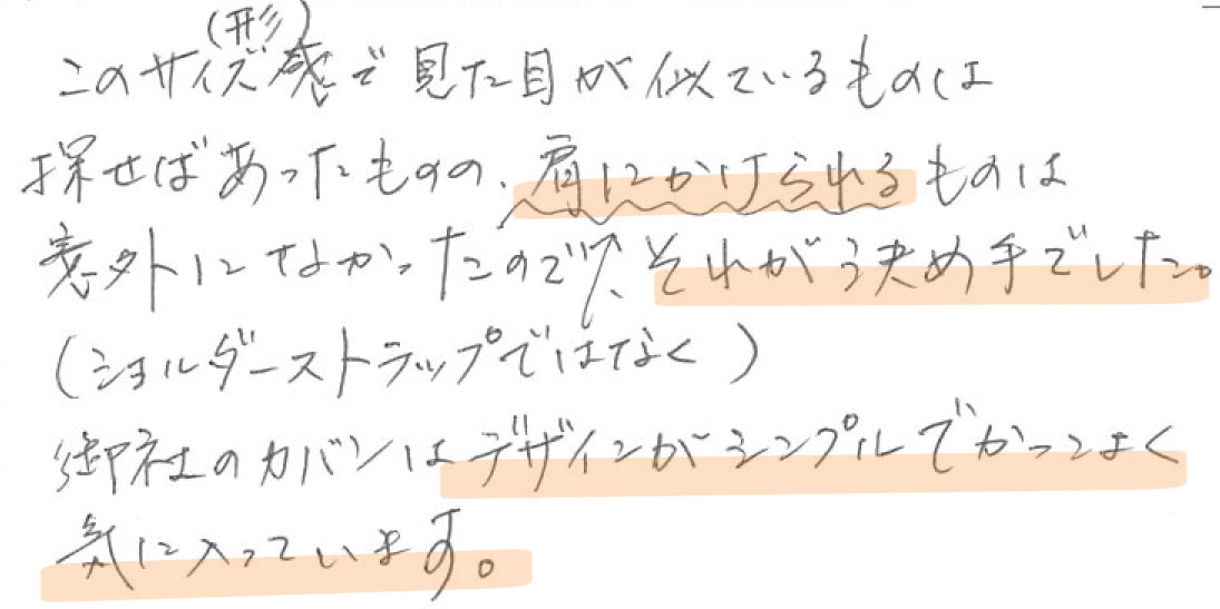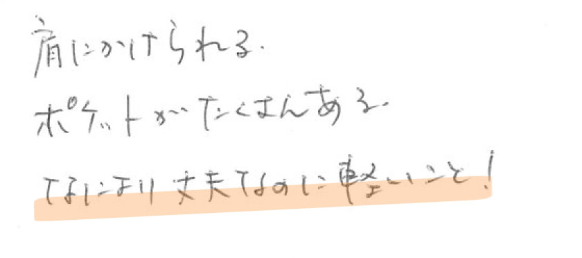 このサイズ感(形)で見た目が似ているものは探せばあったものの、肩にかけられるもの(ショルダーストラップではなく)は意外になかったので、それが決め手でした。御社のカバンはデザインがシンプルでかっこよく気に入っています。