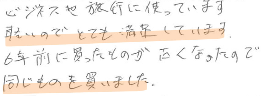 御社のバッグは人生で色々なバッグを使用した中で最高だと思います。