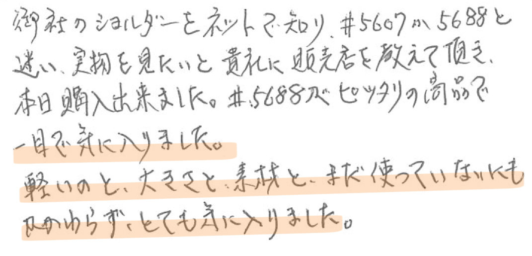 御社のショルダーをネットで知り、#5607か#5688と迷い、実物を見たいと貴社に販売店教えて頂き、本日購入出来ました。#5688がぴったりの商品で一目で気に入りました。 軽いのと、大きさと、素材と、まだ使っていないにもかかわらず、とても気に入りました。