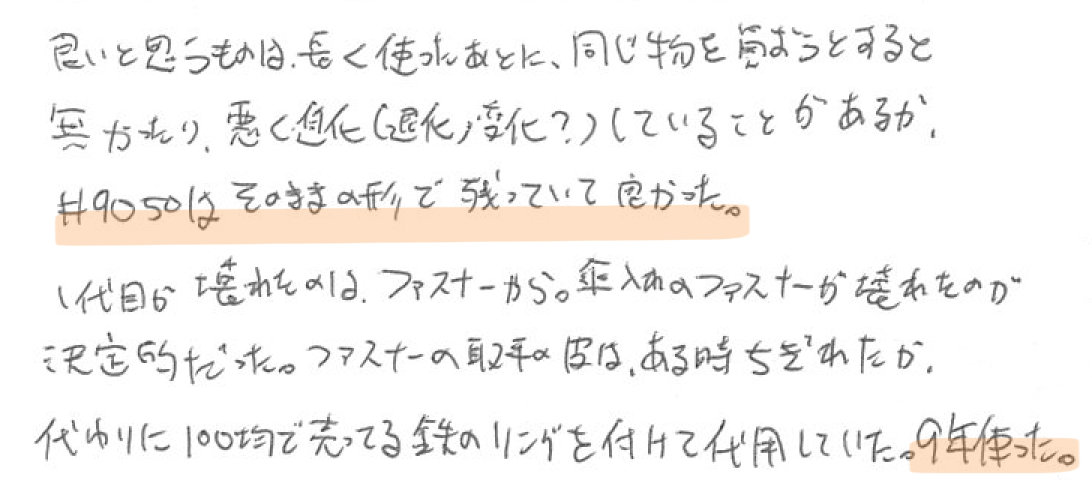 良いと思うものは長く使ったあとに、同じ物を買おうとすると、無かったり、悪く進化(退化、変化?)していることがあるが、#9050はそのままの形で残っていて良かった。1回目が壊れたのは、ファスナーから。傘入れのファスナーが壊れたのが決定的だった。ファスナーの取手の皮はある時ちぎれたが、代わりに100均で売ってる鉄のリングを付けて代用していた。9年使った。